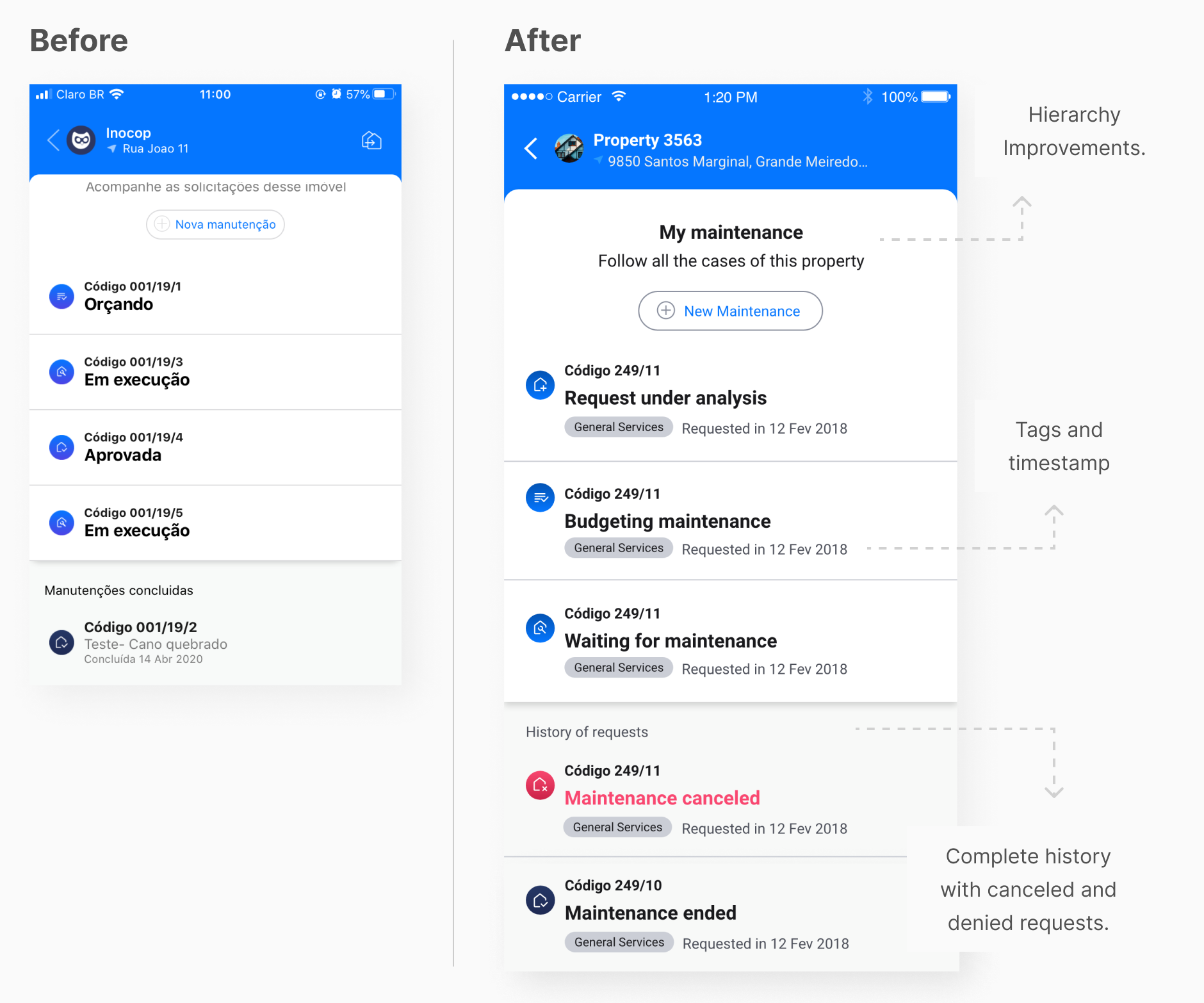 To make the maintenance process easier and faster for our users, we partnered with a repair services provider that allowed users to request and pay for the services online, without the need for a real state agency to mediate this process. To unify the experience, we needed to create an integration with the repair services provider system, letting users request the service and see its progress directly from our app.